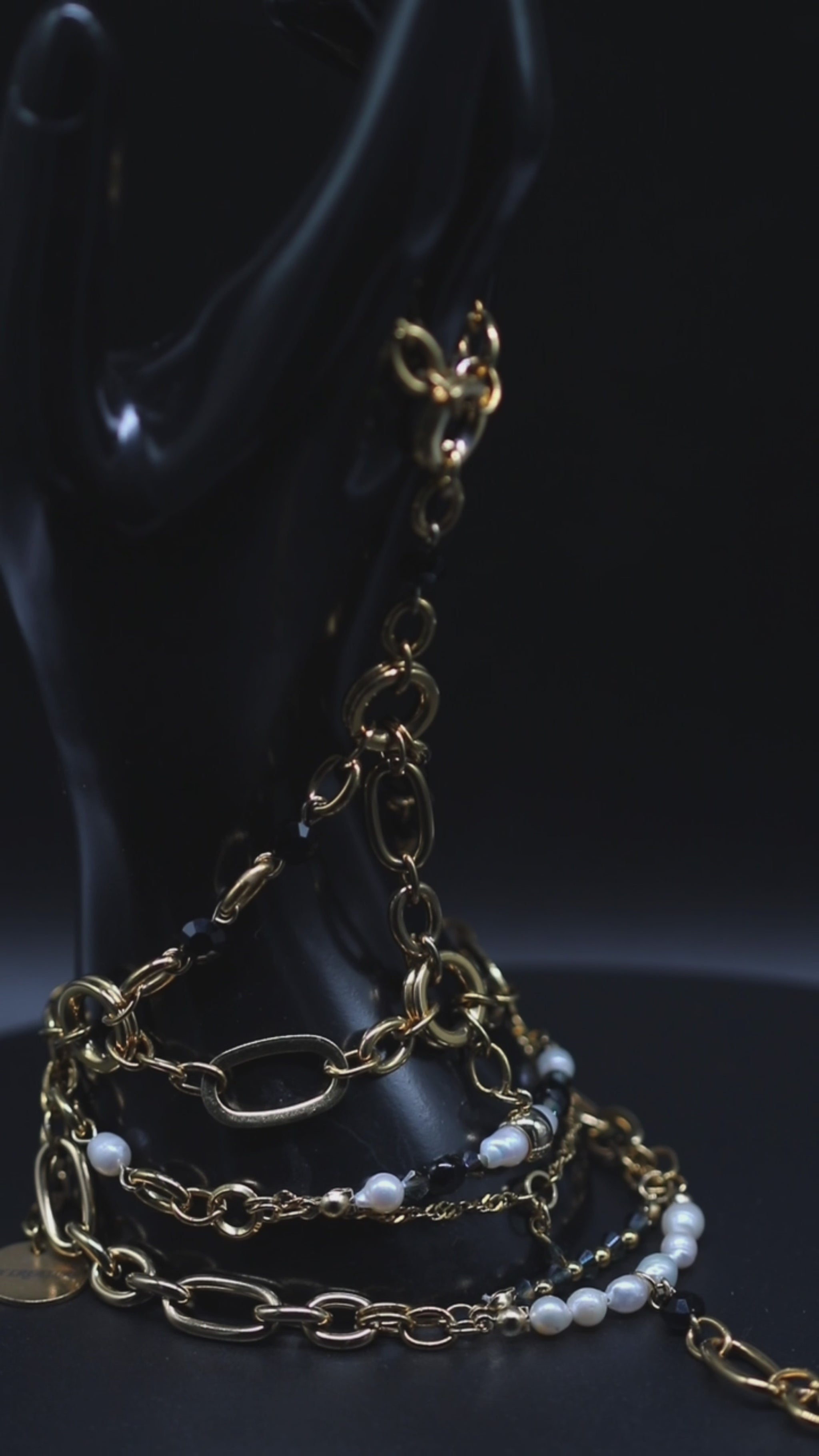 Hilda est une chaîne de doigt faite à la main en acier inoxydable doré, ornée de perles d'eau, de cristaux verts de Preciosa et de perles en verre noir.